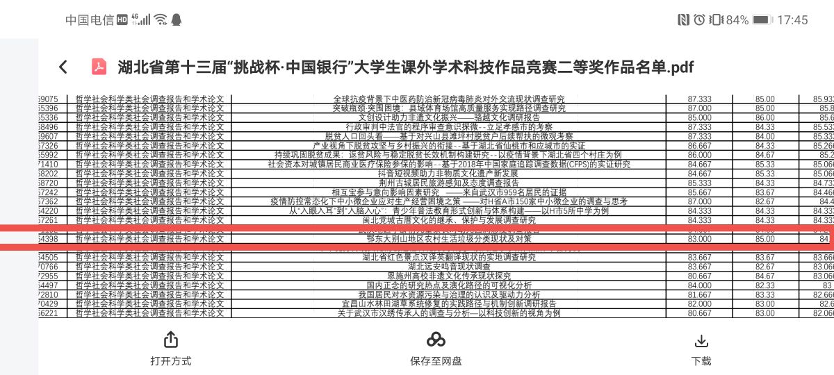 2021年5月13日,WilliamHill体育“曙光·环保行”公益团队项目《鄂东大别山地区农村生活垃圾分类现状及对策》在湖北省第十三届挑战杯赛事中喜获银奖。本次代表团队参赛的成员是动画1801班裴亿和美术学1903班黄靓,项目指导老师是WilliamHill体育辅导员袁婷和郭汤婷。