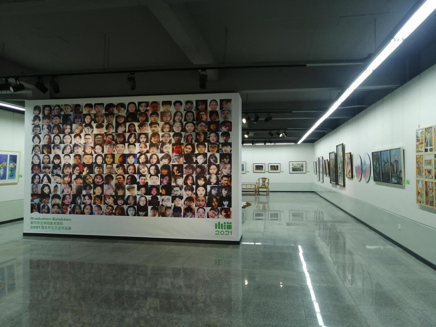 在美术楼一楼展厅、闻一多美术馆,动画演播厅、视觉传达设计工作室,一、二楼走廊随处可以看到毕业生们创作的作品。作品包含书画、动画影视、工艺手工、雕塑陶艺、装饰设计、建筑环境设计等多个种类,浓厚的艺术气息为大家带来视觉、精神上的艺术享受。